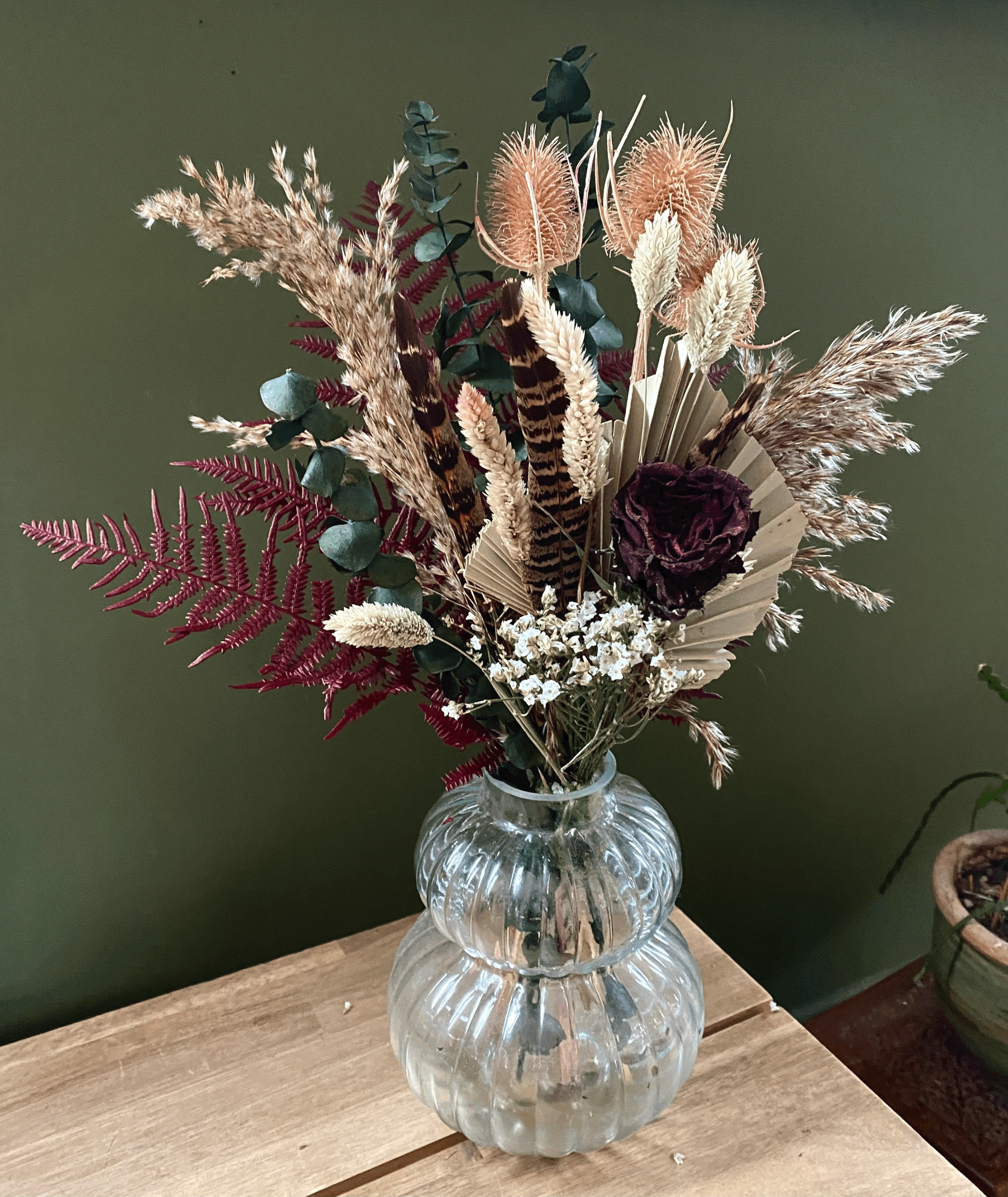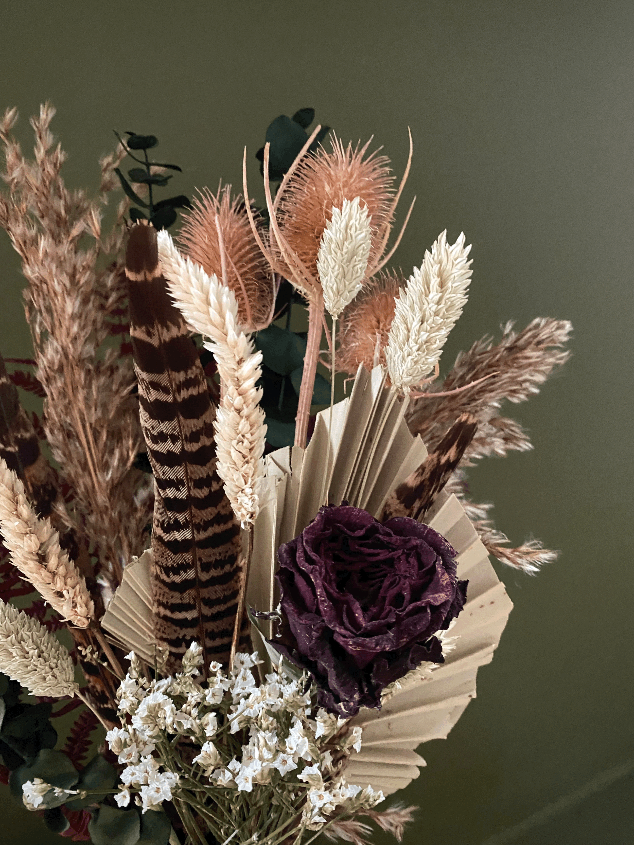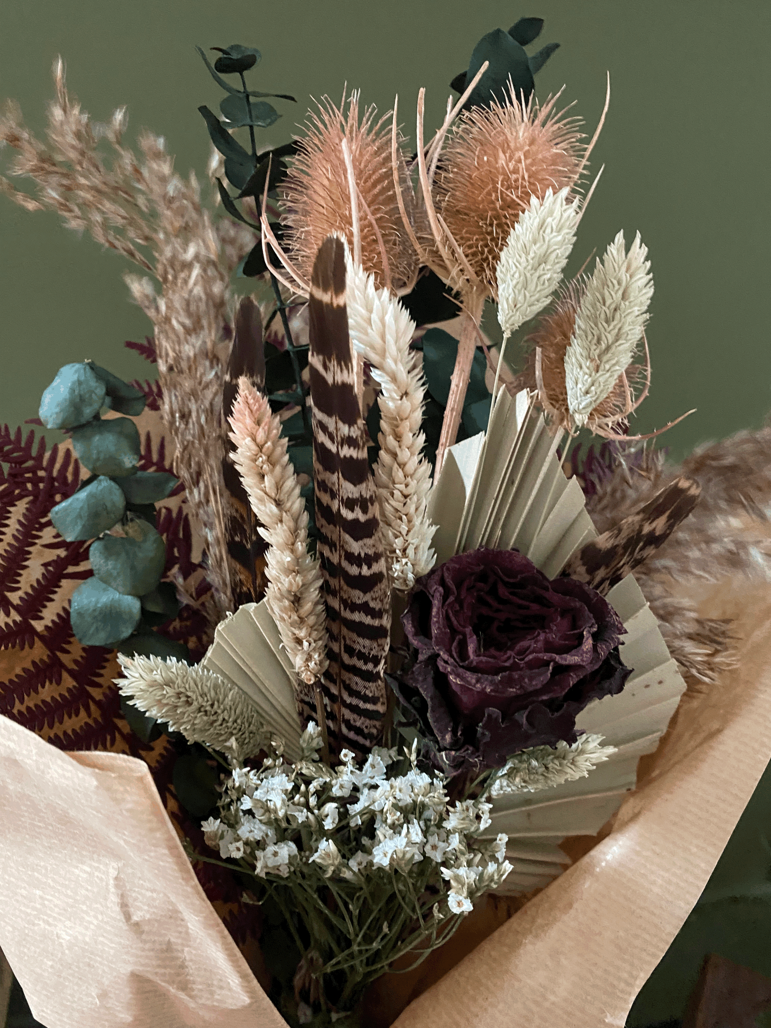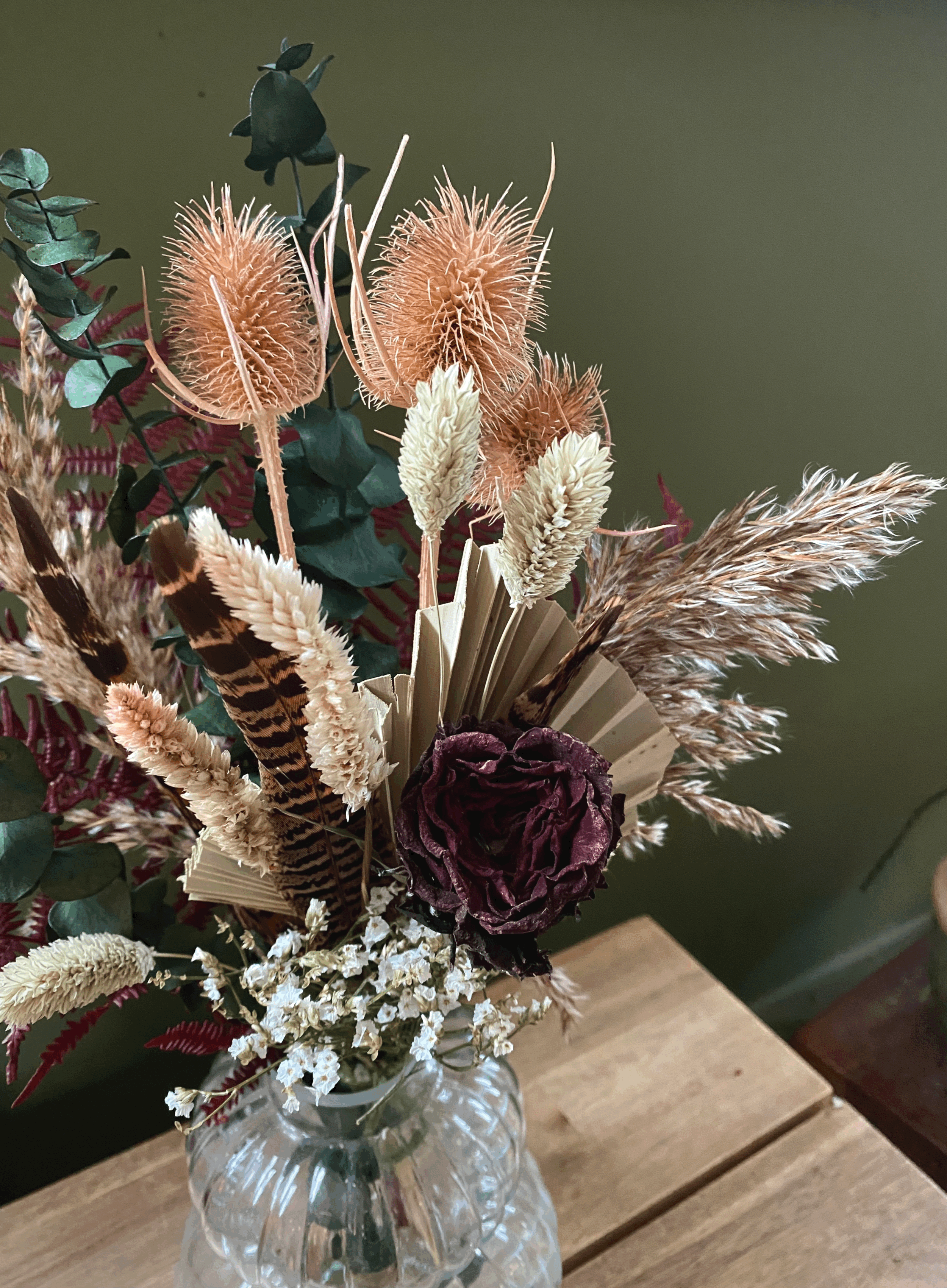Made up of preserved Eucalyptus and ferns and dried roses, thistles, Limon, Grasses and pheasant feathers. Makes for a beautiful everlasting floral arrangement in your home, a gift for a friend or a special occasion.
